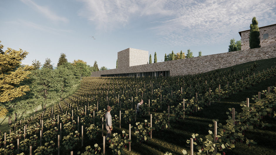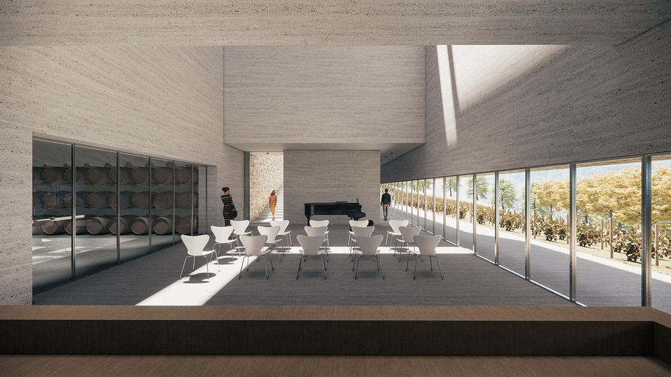 Bir tepeye yerleşmiş Podere Fodespina’nın “3.podere”si, tepeyi oyarak kuzey bağlarına cephe verecek şekilde eğime siner, tepe omurgasındaki taşıt yolunun altından güney bağlarına açılır. Mevcut taş yapıların zemin kotunda yalnızca taş bir küp görülür. Bu küp, alt kotta tüm işlevlerin bağlandığı ve projede çok amaçlı etkinlik alanı olarak kurgulanan merkezi mekânın yüksek örtüsüdür. Yer altına taş küpe doğru perspektifi olan dramatik bir merdivenden inilir. Merdivene bir yansıma havuzu eşlik eder. Yüksek hacimli çok işlevli alan, yeni yapının en dramatik mekânı olarak ziyaretçiyi karşılar. Diğer tüm işlevler bu mekâna açılır. Batıda idari birimler, doğuda karşılama, satış alanı ve restoran, güneyde tadım ve küçük etkinlikleri içerecek sergi/depo alanı yer alır. Her mekân varlık sebebi olan bağlara cephe verir. Fıçı ve şişelerin sergilendiği mahzen (depolama alanı) tadım etkinliklerine ev sahipliği yapmaktan öte, orta mekânın bir uzantısı olarak çalışır. Etkinlikleri güney bağlarına doğru taşır.